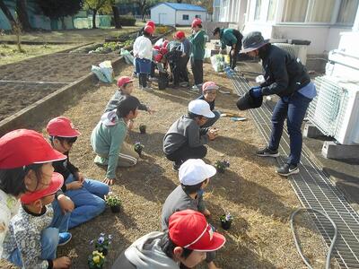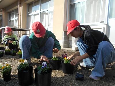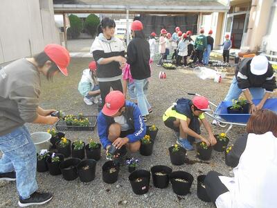 今日は、ポカポカ陽気です。全校児童で、冬から春用の花の苗を植えました。