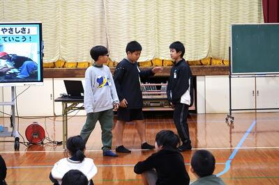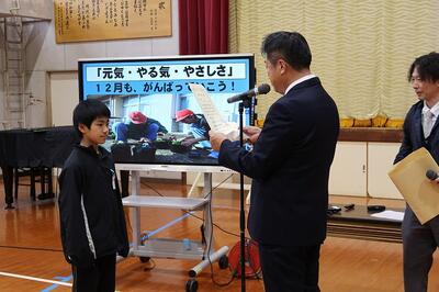 生徒指導部の先生からは、12月の月目標「人に親切にしよう」について話がありました。委員会の児童が、寸劇を披露し分かりやすかったです。表彰もあり、もりだくさんの集会でした。