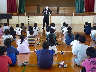 体育館では、桂さんから不審者にあった時の対応の仕方について話をしていただきました。「いかのおすし」で対応すること、ランドセルをつかまれた時にはランドセルを外して逃げること、逃げるときには20秒間または5~6秒間全力で走って逃げることやジクザグに走ることなどが有効であることなどを学びました。