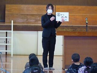 始業式の後、今月の目標についての話があった後、川南町社会福祉協議会の「シンボルマークのイラストと手書き文字コンクール」で入選した渡邊 壱心さんの表彰がありました。