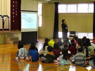 ステージ上に立たれた8名の先生方のお話に耳を傾け、拍手をする姿に子どもたちの優しさを感じました。