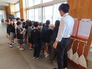6年2組の教室から1年生教室の方を見ると、1年生がろう下に並んでいるのが見えました。