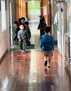 子どもたちは一瞬驚きを見せますが、いつもどおり元気な声であいさつする子どももいれば、恥ずかしいのか、いつもに比べ小さめの声になる子どももいました。