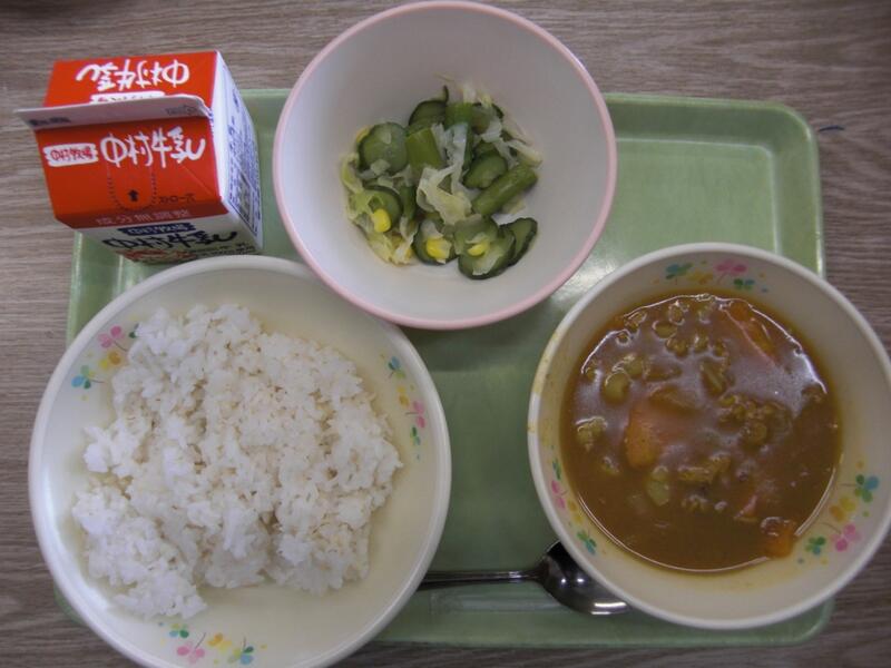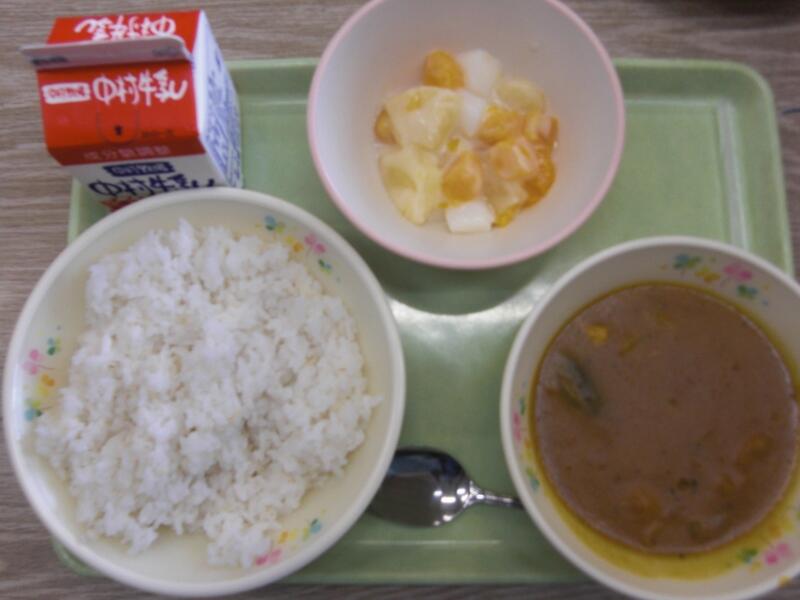 この日は、夏野菜カレーでした。いつものカレーに、夏野菜のかぼちゃやなすが入っています。子どもには、そのままだと苦手な食材ですが、カレーにすると夏野菜の甘みが出て、おいしく食べられたみたいです。