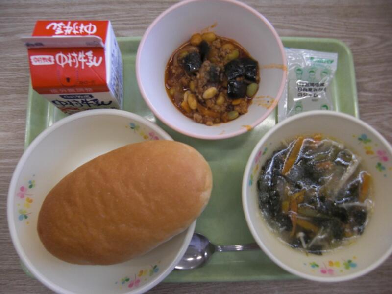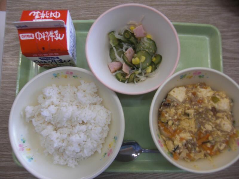 この日の大きいおかずは、マーボー豆腐です。給食で使われる豆腐は、都農町内の豆腐屋さんに届けてもらっているそうです。都農町内の豆腐屋さんの豆腐を使って、毎回おいしい給食ができているんですね。
