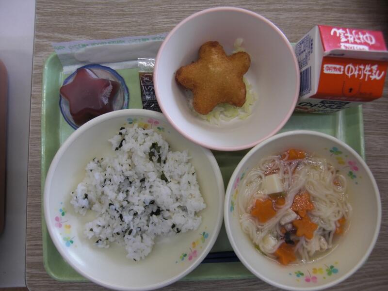 今日は七夕です。あいにく梅雨空が続いているので、本物の天の川を見ることができるかどうか分かりません。しかし、今日の給食は、天の川に見立てたそうめんと星の形をしたコロッケとゼリーの組み合わせです。そうめんには、星形のにんじんも入っていて、星いっぱいの給食でした。子どもたちは、七夕を感じながら食べることができたでしょう!