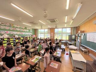 また、全校児童で歌う「折り鶴」という曲の練習も音楽の時間や朝の会や帰りの会で取り組んでいます。