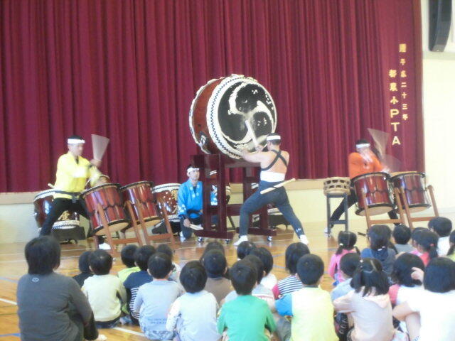 今年は、『橘太鼓 響座』でした。体育館には、大きな太鼓がいくつも準備され、体育館にやって来た子どもたちは、その大きな太鼓に驚いた様子でした。演奏が始まると、太鼓の力強い音が体育館中に響きわたり、体に振動が伝わるほどの迫力でした。