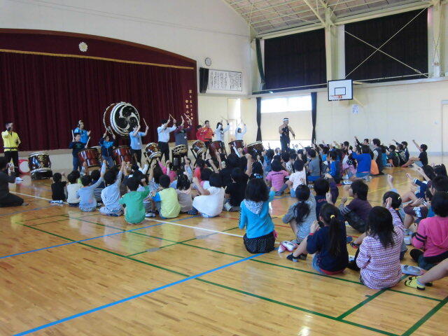 途中子どもたちや先生方が体験する場面もありました。あまり触れることのない太鼓を叩くことができ、子どもたちも嬉しそうでした。太鼓を叩く子どもたちだけではなく、全校児童が太鼓の音リズムに合わせて声を出したり、手を上にやったりと、体育館が一体となり、太鼓の音を楽しみました。