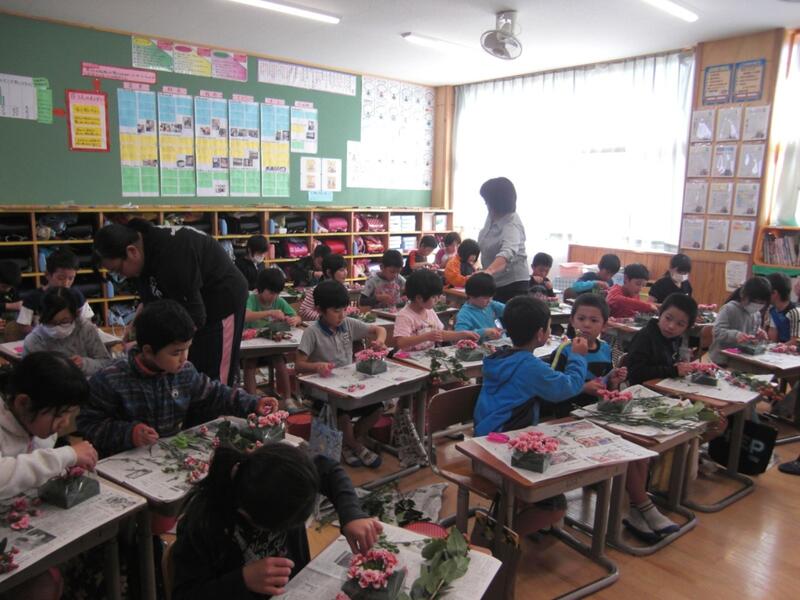 みんな同じ花を使ったにも関わらず、子どもたち一人一人の作品にそれぞれのよさがあり、素敵な作品ができあがりました。花を身近に感じることができた1時間になりました。