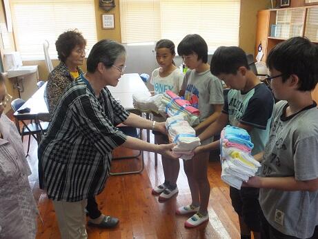 7月17日(火)の休み時間に、老人クラブ連合会女性会の方々から、200枚程の雑巾をいただきました。一枚一枚の雑巾が手作りであり、心のこもった雑巾をいただきました。