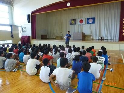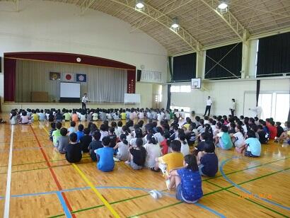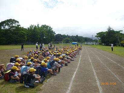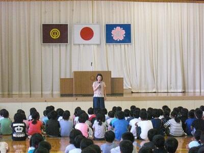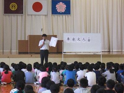 終業式の後には、安全担当の先生から、自分の命、そして周りの人の命を守るために気を付けること(車、水、火、人、金)についてのお話がありました。(※本日配付される”夏休みのくらし”を御家庭でも子どもたちと一緒に御覧ください。)