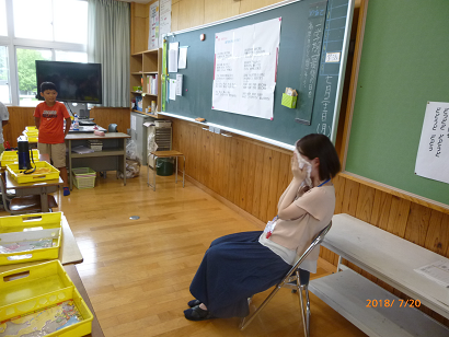 次に、アイマスクをして視覚障がいの福祉体験をしました。アイマスクをしたままで友達と向かい合って手を合わせたりじゃんけんをしたりしました。子どもたちはいつもと違ってうまくできなくて困っていました。