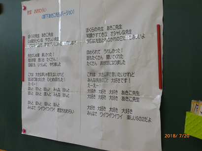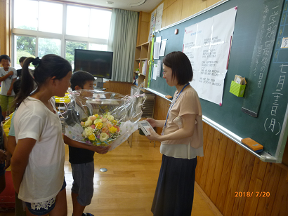 明日から38日間の夏休みに入ります。けがや事故等に気を付け、「命を大切」にして、校長先生のお話にもあったように、たくさんのことにチャレンジして、充実した夏休みにしてほしいです。8月28日(火)、元気いっぱいの233名の子どもたちに会えるのを楽しみにしています。