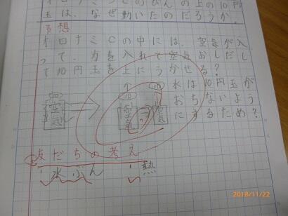 この日の結論としては、どうやら「中の空気が温められて、体積が大きくなって10円玉を動かしたのでは?」ということをたくさんの子どもが発表しました。