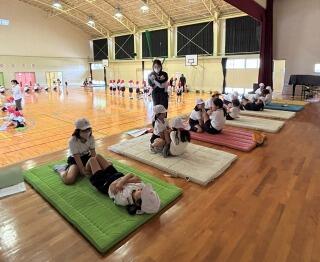 体育館で、立ち幅跳び、長座体前屈、上体起こし、反復横跳びをしていました。