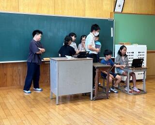 どの学級も、モニターを見ながら係の先生の話を真剣な表情で聞いていました。