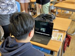 この日は、タブレットを活用し、調べたことを動画にするという作業をしていました。音声も録音するので、別の部屋で本番を行っていました。