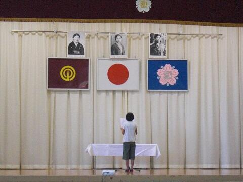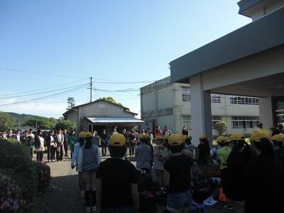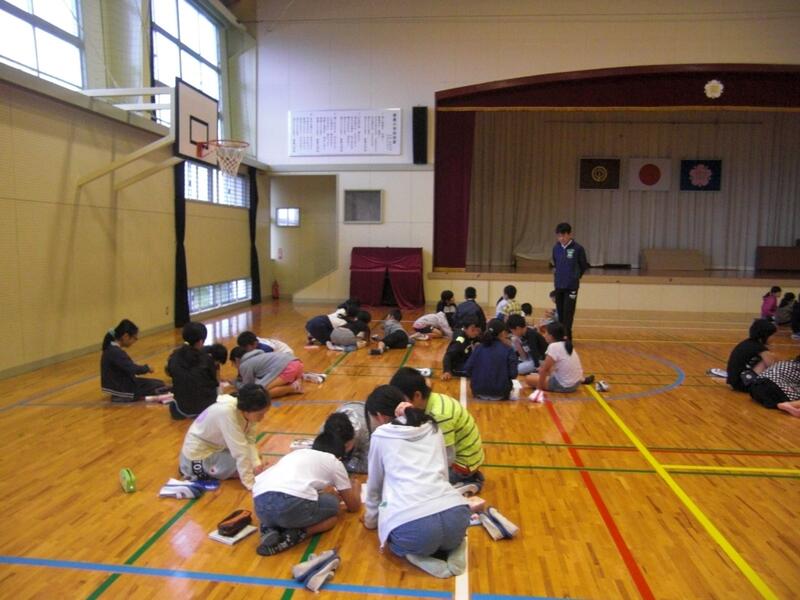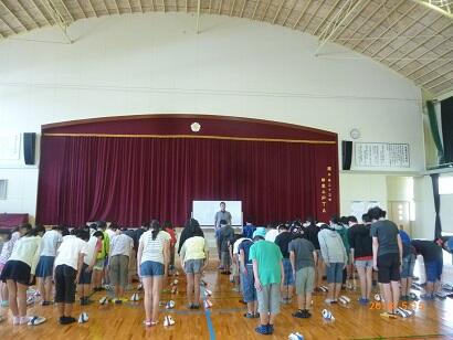 体育館(後半に、6年生が三先生慰霊碑にいき献花を行います。)