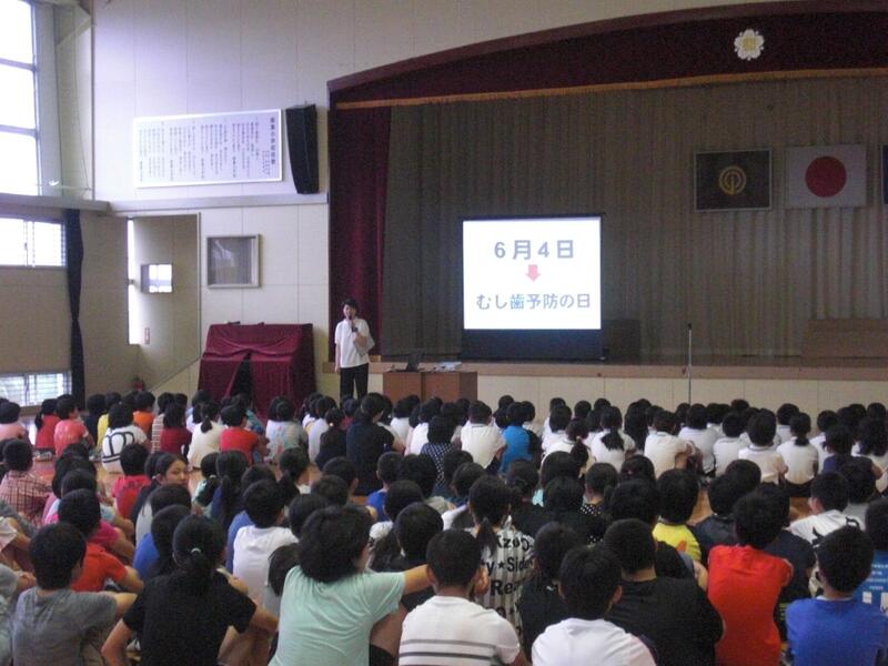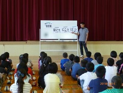 次に、鈴木先生から、5月の月目標『基本話型に気を付けて、進んで発表しよう。返事は短くはっきりと。』についてのお話がありました。上手に発表をするコツとして、「返事をする時は『はい』のあとに小さな『っ』を入れて『はいっ』と返事をすること」、「発表する時は、『相手にしっかりと伝わっているか』を意識して、『ゆっくり、はきはきと、最後まで話す』こと」について確認した後、実際に口の開け方などを練習しました。