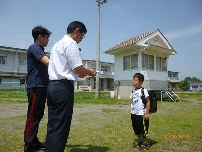 昨年は「あいさつ名人」。そして、今年は「あいさつ隊長」と元気のいいあいさつをずっと続けている児童です。