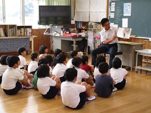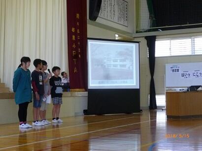 5月9日の読み聞かせ集会は、読み聞かせボランティアの方との顔合わせ会でした。体育館で、2冊の絵本の読み聞かせもしていただきました。1冊目は、「どうぶつ川柳 ぼくだ~れ?」という本。クイズのようになっているので、子どもたちも答えを言いながら聞いていました。2冊目は、「1年生になったら」という歌の絵本です。みんなで、♪1年生になったら~1年生になったら~♪と合唱しました。
