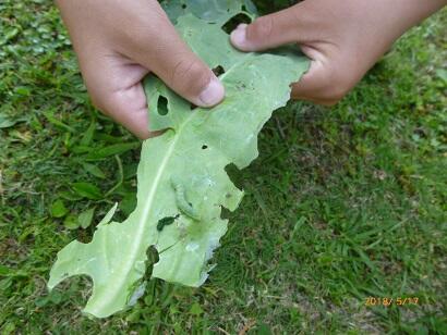 この幼虫を見付けたら要注意です。「セスジスズメ」という蛾の幼虫です。1日でホウセンカの葉を食べ尽くすほどの食欲です。これから夏休み、家庭へ持ち帰り種を取るまで観察を続けますが、この虫が付いていたら必ず駆除してください。