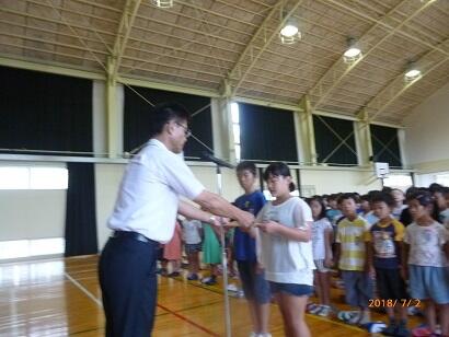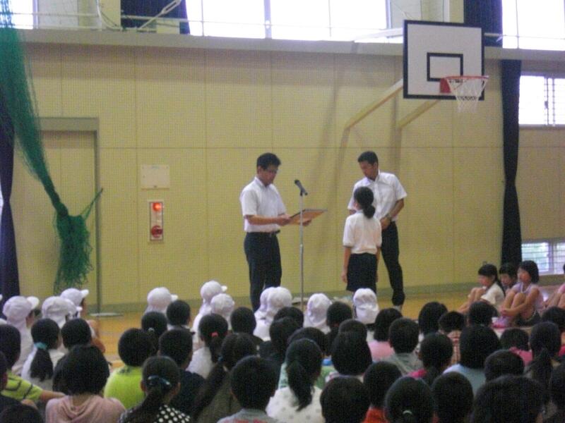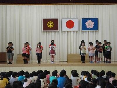 最後に、表彰が行われました。柔道で4年生の『石本夢乃さん』、陸上で4年生の『三輪樹里さん』、『河村竜弥さん』、6年生の『陶山元気さん』、ピアノで3年生の『荒川絢音さん』が銅賞で表彰されました。おめでとうございます!今後のますますの活躍を期待しています!