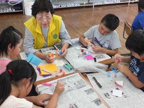 作り始めはなかなか構図が思い浮かばず、苦戦していた子どももいましたが、色画用紙や段ボール、ビーズ、綿など、家から持ってきた材料を駆使して見事なステージを作り上げていました。