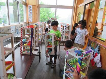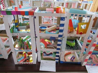 コロコロガーレとは、一番上のステージから一番下のゴールまでビー玉を転がすゲーム。子どもたちは、ゴールまでの道や柱の装飾などをがんばりました。