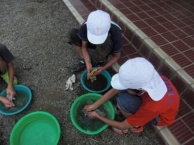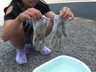 洗剤が入っているおけの水は、みるみるうちに、茶色く濁り、すぐに軍手もきれいになっていきました。しかし、水だけしか入っていないおけで洗った軍手は、なかなかきれいにならず、子どもたちは一生懸命軍手をこすって、汚れを落としていました。
