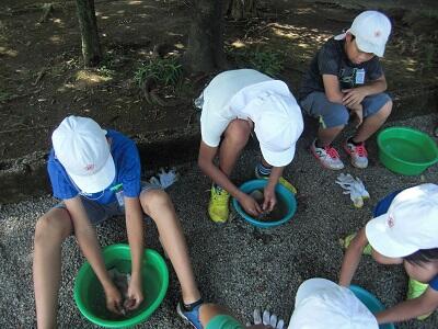その軍手を、洗剤が入っているおけと水だけしか入っていないおけを使って、手洗いしていきました。