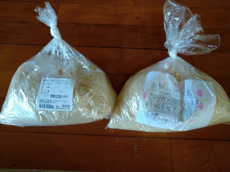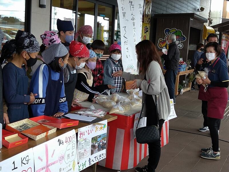 12日(金)、5年生が「道の駅つの」で米の販売をしました。例年5月に地元の方の田を借りて育った稲を、JAの方が刈っていただき、精米した米です。今回、ぜひ道の駅で販売体験をさせたい、という思いを、地域学校協働事業の方に尽力いただき実現しました。子どもたちの中には「売れるかな」という不安もあったのですが、全く問題なく、予定よりも早めに完売することができました。販売前後には、運動会で披露したエイサーを踊り、来ていただいた方々にもう一度お披露目することもできました。子どもたちは「やりきった」という感動の満ちた表情を浮かべていて、温かい地元の方のお力添えに心から感謝しているところです。数社の報道関係の方にも足を運んでいただき、子どもたちの輝きを発信していただきました。ありがとうございました。