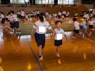 幼保小中連携と言葉で言うのは簡単ですが、初めて出会う園児や他校の1年生とさっと打ち解けられるわけではありませんでした。しかし、一緒に体を動かしながら、6年生が園児に手を貸してあげる場面や、上手にできたことを誉めている場面、互いの頑張りを称え合う場面などが見られました。
