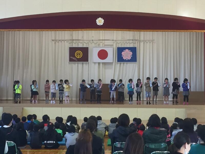 1年生が新入児を前に詩の群読や歌、鍵盤ハーモニカの発表をしました。