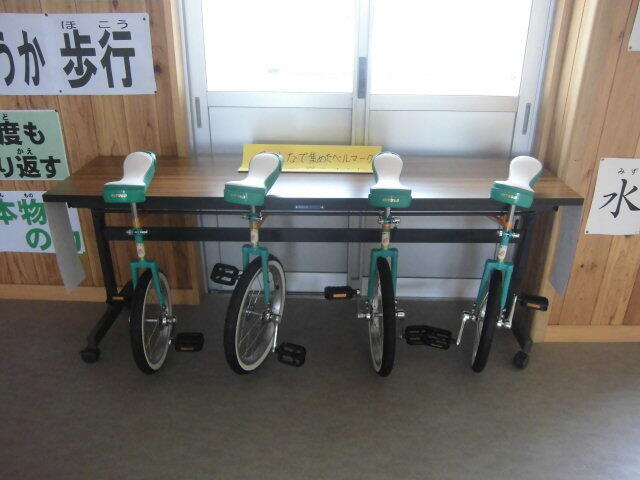 これまでに集めたベルマークで子ども達に大人気の一輪車(しかもノーパンクタイヤ!!)を4台(76,369点=76,369円相当)購入し、22日(月)から児童玄関前に展示しています。26日(金)の参観日で保護者の皆様にも御覧いただいた後、使用開始の予定です。
