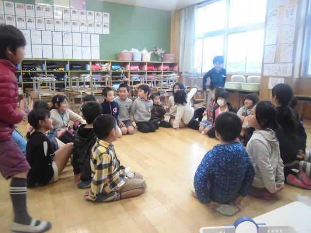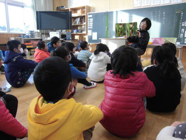 第1回目だったこの日は、ボランティアの方がプレゼンテーションによる読み聞かせをしてくださいました。『どうぶつまぜこぜあそび』と『ねこのピート はじめてのがっこう』でした。参加型の読み聞かせをしてくださったので、子どもたちは楽しそうにしていました。
