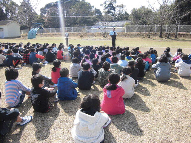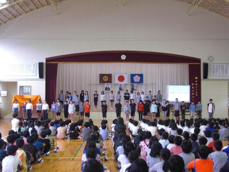 5月2日(月)、全校朝会がありました。今月の学習目標は「基本話形に気を付けて、すすんで発表しよう」、「返事は短くはっきりと」です。全校児童で、『ちいさい おおきい』の詩の音読や返事の練習をしました。上級生をお手本に、下級生もよく声を出して頑張っていました。