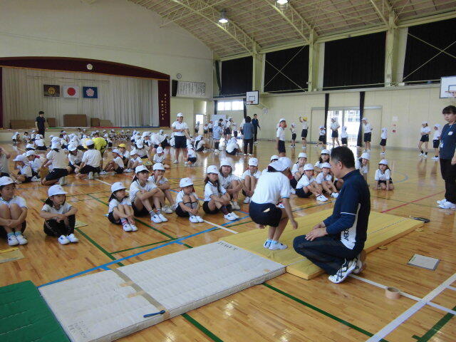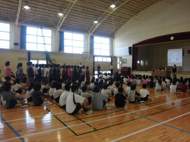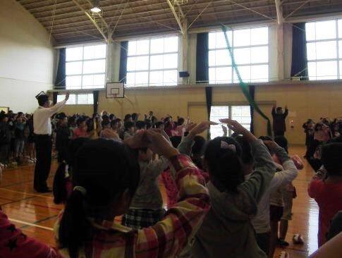 途中子どもたちや先生方が体験する場面もありました。あまり触れることのない太鼓を叩くことができ、子どもたちも嬉しそうでした。太鼓を叩く子どもたちだけではなく、全校児童が太鼓の音リズムに合わせて声を出したり、手を上にやったりと、体育館が一体となり、太鼓の音を楽しみました。