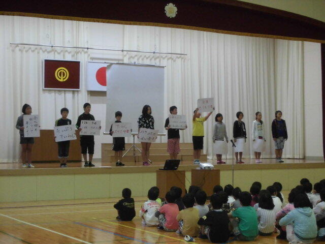 11月の月目標は、『食べ物と体について考えよう』となっていて、取り組む3つのことについて、給食委員会の子どもたちが、体育館の後ろまで届く大きな声で発表してくれました。
