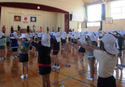 10月5日(月)の業間の時間に、体力向上集会が行われました。体力テストの結果から、都農小学校の課題と考えられるものを重点的に改善していくため、「都農小準備運動」と名付け、体育の時間に取り組んでいくストレッチ体操等についての説明がありました。体育の時間だけでなく、遊びの中や家庭でもできるものばかりです。体力の向上を目指して、みんなで頑張ります。