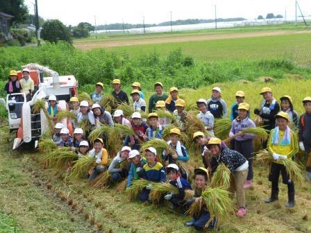前夜の雨で実施が危ぶまれましたが、無事に実施することができました。農家の方に、鎌の使い方や稲刈りの仕方を教えてもらいました。初めはおそるおそる刈っていた子も、慣れてきたら、とても楽しそうに稲刈りをしていました。最後に、コンバインで稲を刈り取りました。コンバインにも何名か乗せてもらい、初めての体験に驚きと喜びの表情を見せていました。雨上がりの蒸し暑い中での作業でしたが、みんな頑張りました。