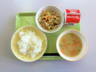 写真の手前右側にあるのがにんじんポタージュです。これだけにんじんの色になっているということは、かなりの量のにんじんがすりおろされているのだと思います。この濃厚なにんじんポタージュをいただきながら、にんじんが苦手な子どもたちも、気づかぬうちににんじんを食べてるんだよなぁと思うと、ちょっと嬉しくなりました。姿が見えなくても、たくさんのにんじんが入ったポタージュ。にんじん嫌いの子供たちを思う栄養教諭の先生のお心遣いに感謝です。