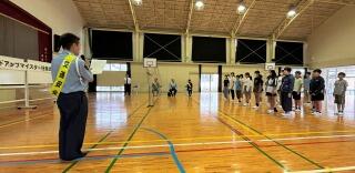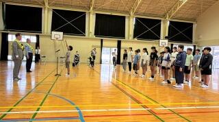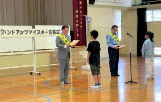 今日の6時間目に高鍋警察署の皆様や都農町長の坂田様、教育長の中西様に来校いただき、ハンドアップマイスター任命式を行いました。
