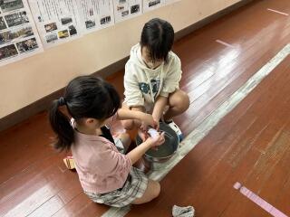 これは、6年生が1年生に雑巾の絞り方を教えているところです。私が教えてほしいと頼んだわけではなく、6年生の方から声をかけ、教えてくれました。