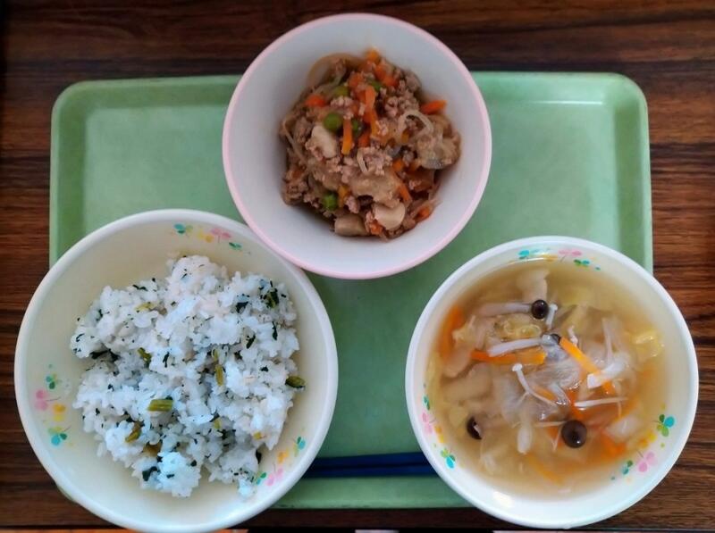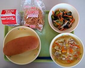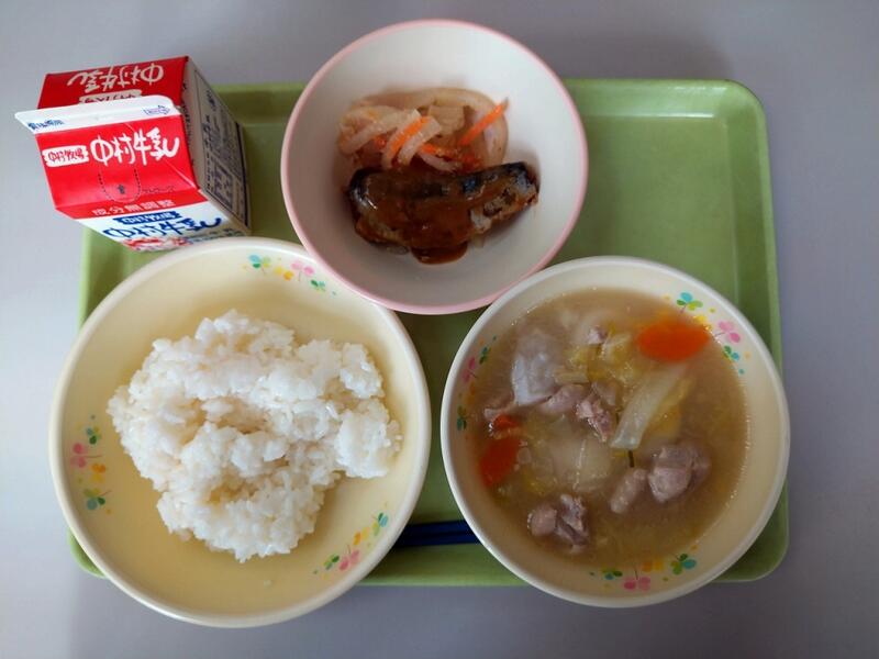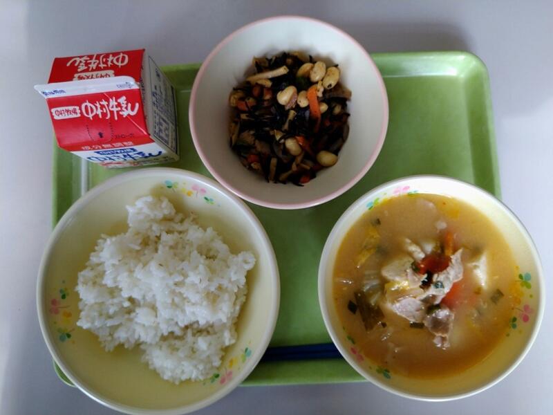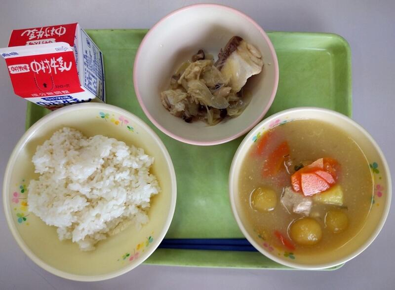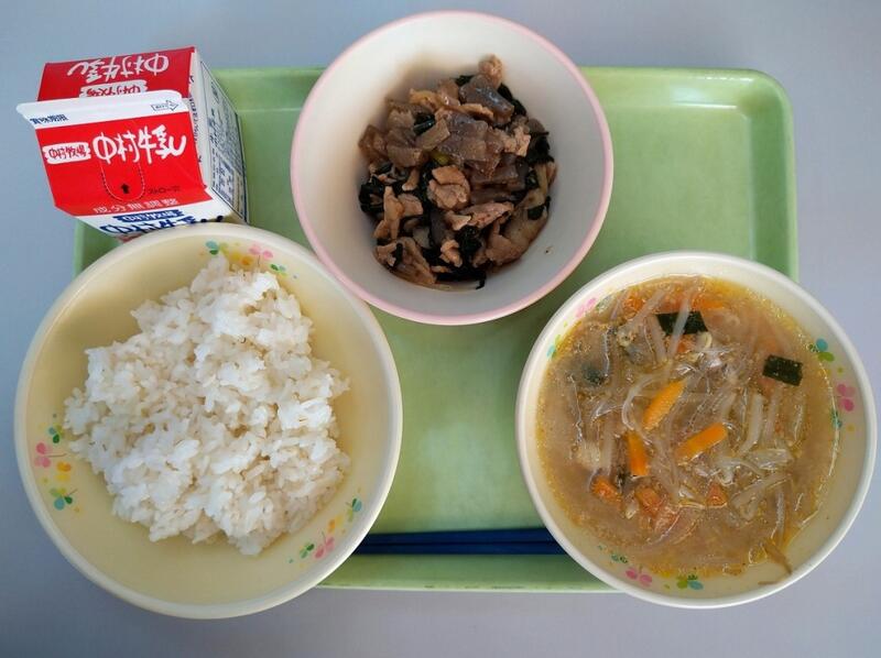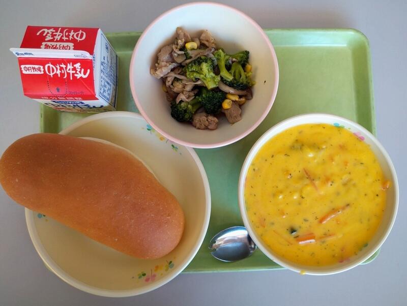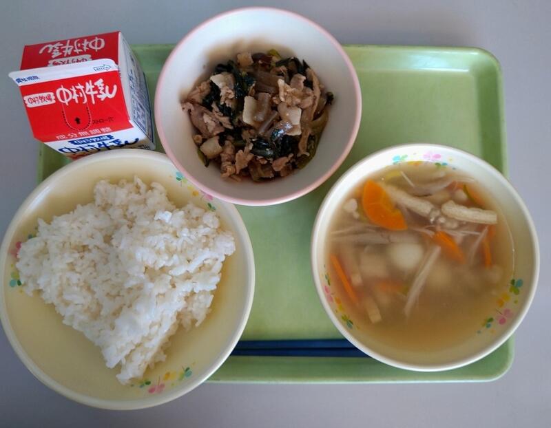 「今日のスープに使用されている、豚肉ですが、豚の先祖は何だと思いますか?豚の先祖は姿がよく似ているいのししです。野生のイノシシが家畜として飼われるうちに、えさが探せずだんだん鈍くなり、まるまるとした豚になったという事です。豚肉には、元気に活動するための手助けをする栄養が含まれています。しっかりと食べるようにしましょう。」