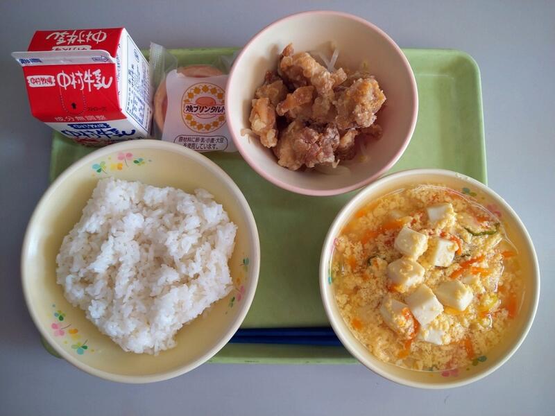 「今日は、「お肉」のお話です。今日の給食では県内産の豚肉と鶏肉の2種類のお肉が使われています。お肉は使用する種類や部位によって味や含まれる栄養に違いがあります。その中でも共通しているのが私たちの体をつくるもとになるたんぱく質を含んであることです。なのでしっかりと食べるようにしましょう。」
