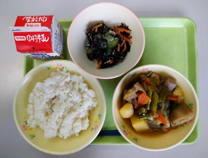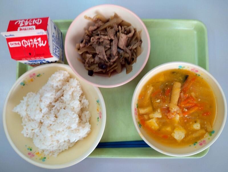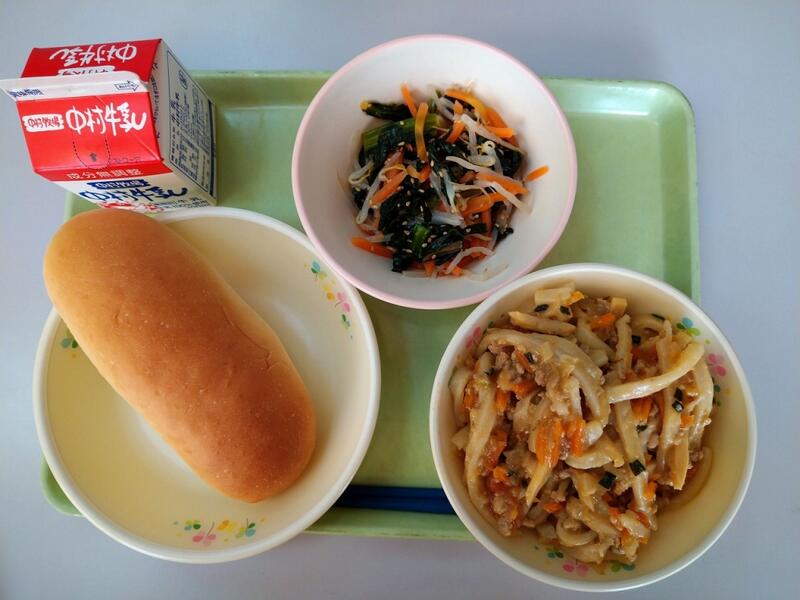 「今日は、「ごぼう」のお話です。ごぼうは、中国から薬として日本に伝わりました。なので野菜としてごぼうが食べられているのは、日本だけだそうです。また、ごぼうには、食物繊維の他に骨づくりを助けてくれるマグネシウムや味覚や嗅覚の働きを助けてくれる亜鉛なども含まれていますよ。残さずよく噛んで食べるようにしましょう。」