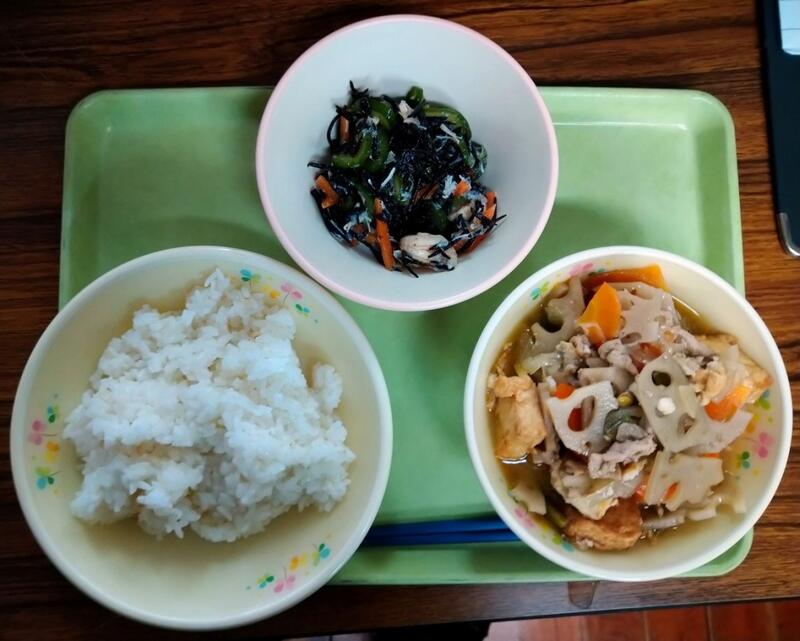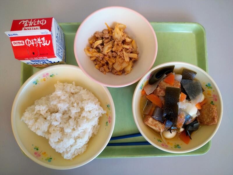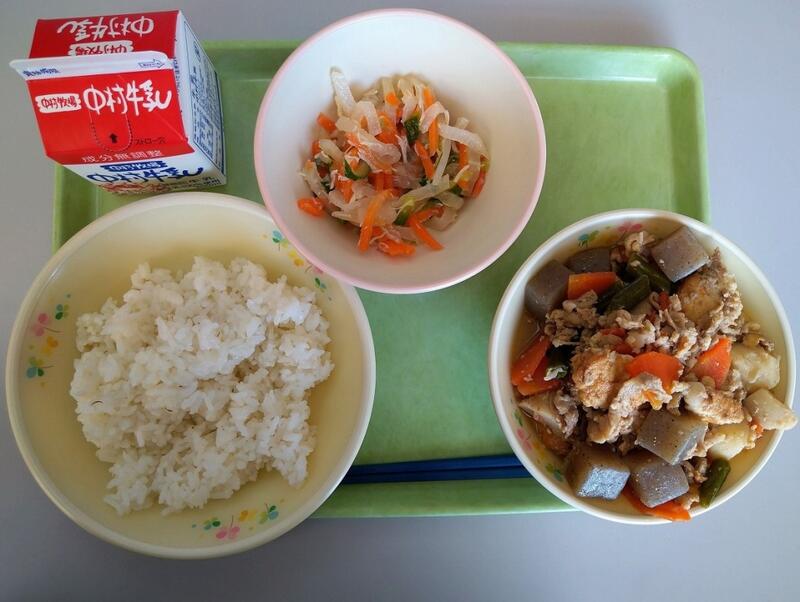「「がんも」とは、がんもどきのことですが、みなさんは、この「がんも」の原料を知っていますか?・・・答えは、豆腐です。豆腐をつぶして、いろいろな野菜を混ぜ込み、丸く形を整えて、油で揚げたものが「がんも」です。おでんや煮物に使われることが多いです。今日の給食は含め煮にしました。食べ慣れていない人がいるかもしれませんがしっかりと食べるようにしましょう。」