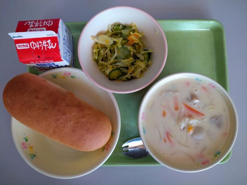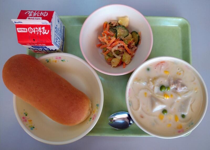 「コッペパンには、バターや牛乳などが入っていないので、市販のパンよりかたくて、味がありません。クリームやジャムがついていない日は食べにくいかもしれませんが、コッペパンは主食です。おかずと牛乳と交互に食べて、よく噛んで食べるようにしましょう。また、今日のようなシチューの時にはパンをシチューにつけて食べるのもおすすめです。」